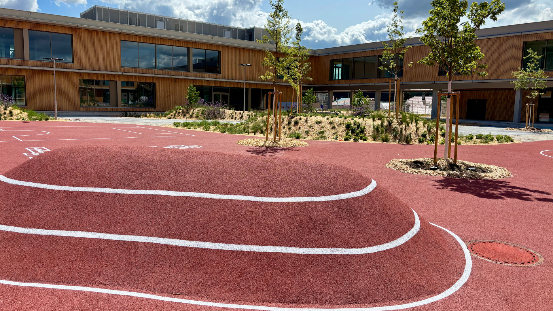 Dominantou školy je již zmiňovaný centrální dvůr o rozměrech 50 × 50 metrů, který je navržen jako multifunkční venkovní prostor. Aby byl dobře využitelný a zároveň řešil vsakování dešťových vod, architekti pro jeho povrch zvolili vodopropustný beton Pervia od společnosti Cemex. „Potřebovali jsme co největší zpevněnou plochu, která bude zároveň vsakovat dešťovou vodu,“ říká Ondřej Pihrt, architekt ze studia SOA. Materiál je podle jeho názoru překvapil nejen funkčními vlastnostmi, ale i povrchem a dodává: „Přes svou pórovitost nás překvapil optickou i haptickou kvalitou a použitelností. Není drsný, takže je bezpečný a příjemný na omak. Navíc díky propustnosti se na něm nedělají louže a v zimě námraza.“