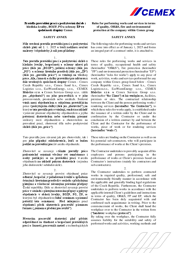 Pravidla provádění prací a poskytování služeb z hlediska kvality, BOZP, PO a ochrany ŽP ve společnosti skupiny Cemex.