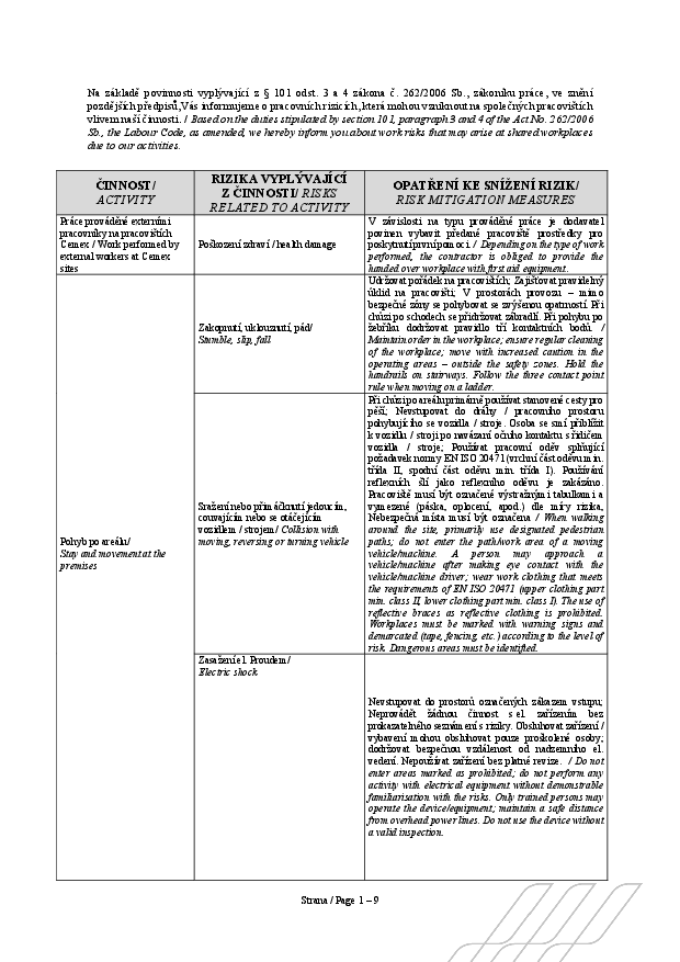 Níže naleznete dokumenty ke stažení Safety Annex a Pracovní rizika v české a anglické verzi.