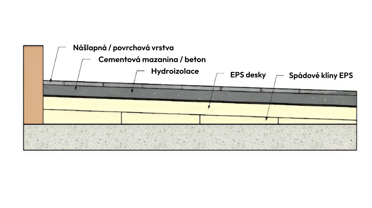 Příprava pro realizaci spádových klínů může být různá. Může se jednat o lití do výšek předem nachystaných vlasců, tyčí a podobně. Nejvhodnější řešení však bývá bednění pomocí nařezaných polystyrenových (tepelná izolace) nebo dřevěných desek.