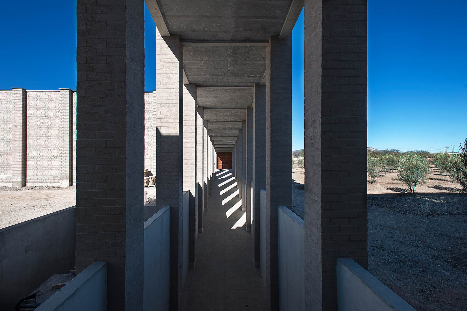 The starting point would be the bodega or wine cellar, where temperature and humidity needed to remain constant for the oak barrels. Thus the decision was made to build underground, 7 meters [22 feet] below the surface. The earth that was extracted from the excavation became part of the construction: it was mixed with cement and local sand in order to produce the "technologically-enriched adobe bricks," which comprise 70% of the construction volume.