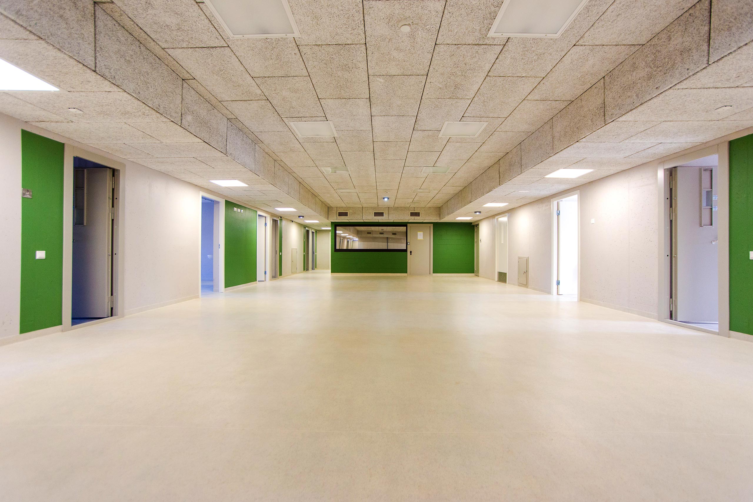The building is divided into three blocks, each with two floors. The A and C blocks contain facilities for individual and group therapies, as well as occupant cells. The B block contains training rooms, a computer lab, library and reading room, and a gymnasium.