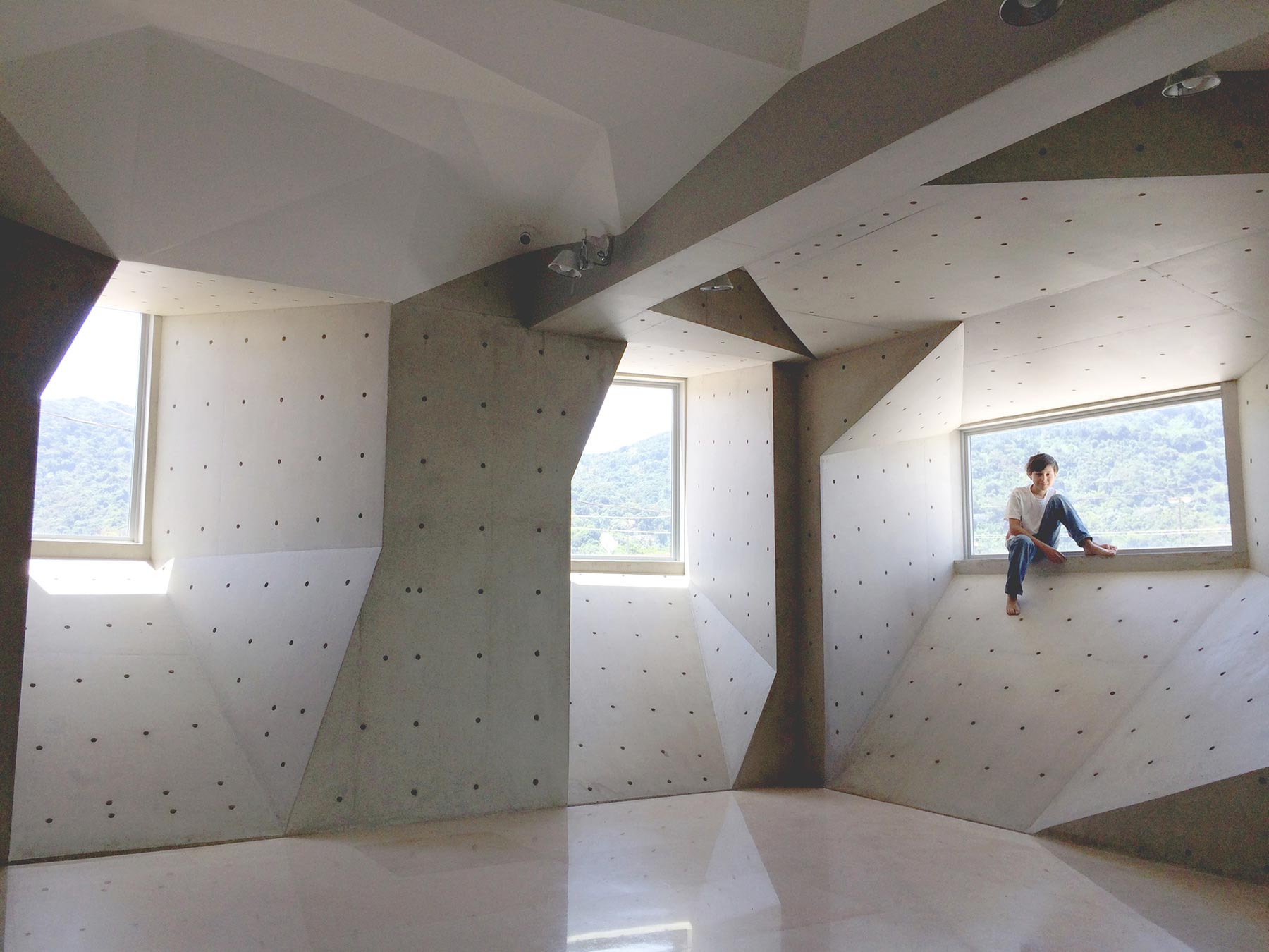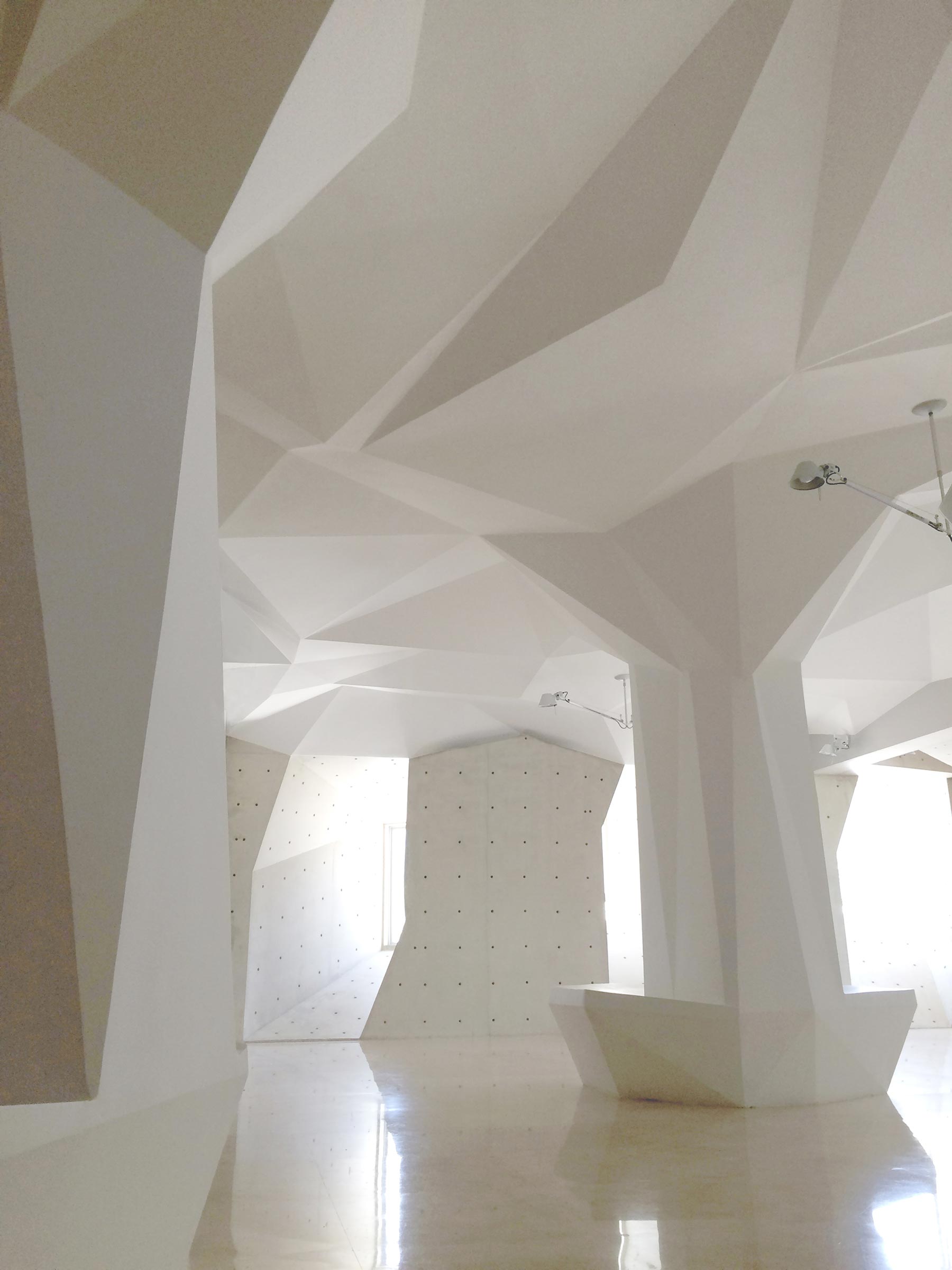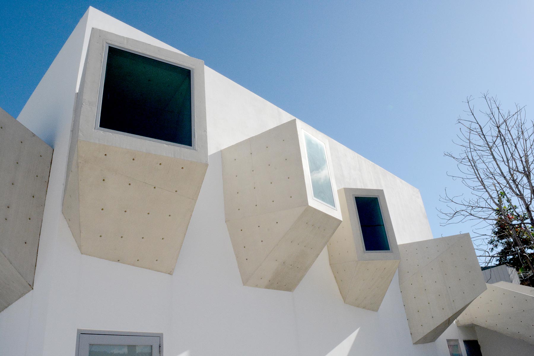 The building’s offices and dental practice were conceived for easy accessibility and so use ramps instead of an elevator or stairs. Exterior “light cannons” protrude from the walls to harness natural light for the previously windowless building. Patients who enter the clinic are also treated to a concrete interior that is as unique as the exterior façade, with geometric shapes on a floating ceiling that alludes to the palate.