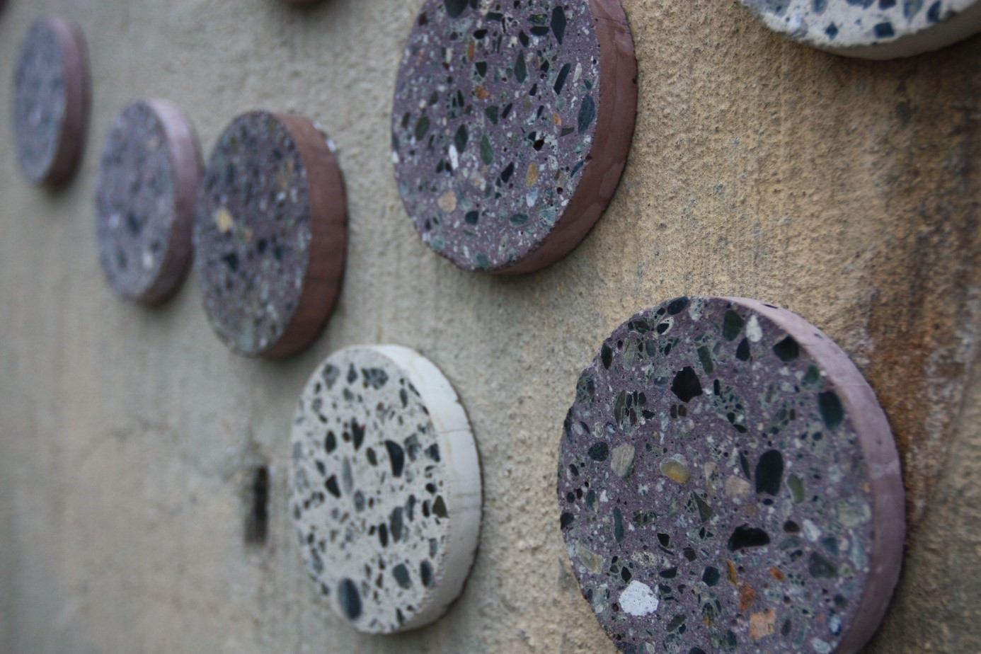 Iveta N.: Jedná se o beton probarvený pomocí odpadního prachu z transportu železné rudy v narvickém přístavu firmou LKAB. Díky probarvení cementové pasty je recyklované kamenivo viditelnější a tvoří krásný dekorativní vzor. Tento typ betonu může být použít k dekorativním účelům po vyleštění a nebo pro běžné pohledové betony. Betonový recyklát je přidán v takové míře, aby byl dosažen požadovaný vizuální efekt – v našem případě propagace a zviditelnění možnosti využití betonového kameniva jako náhrady přírodního kameniva do betonu.