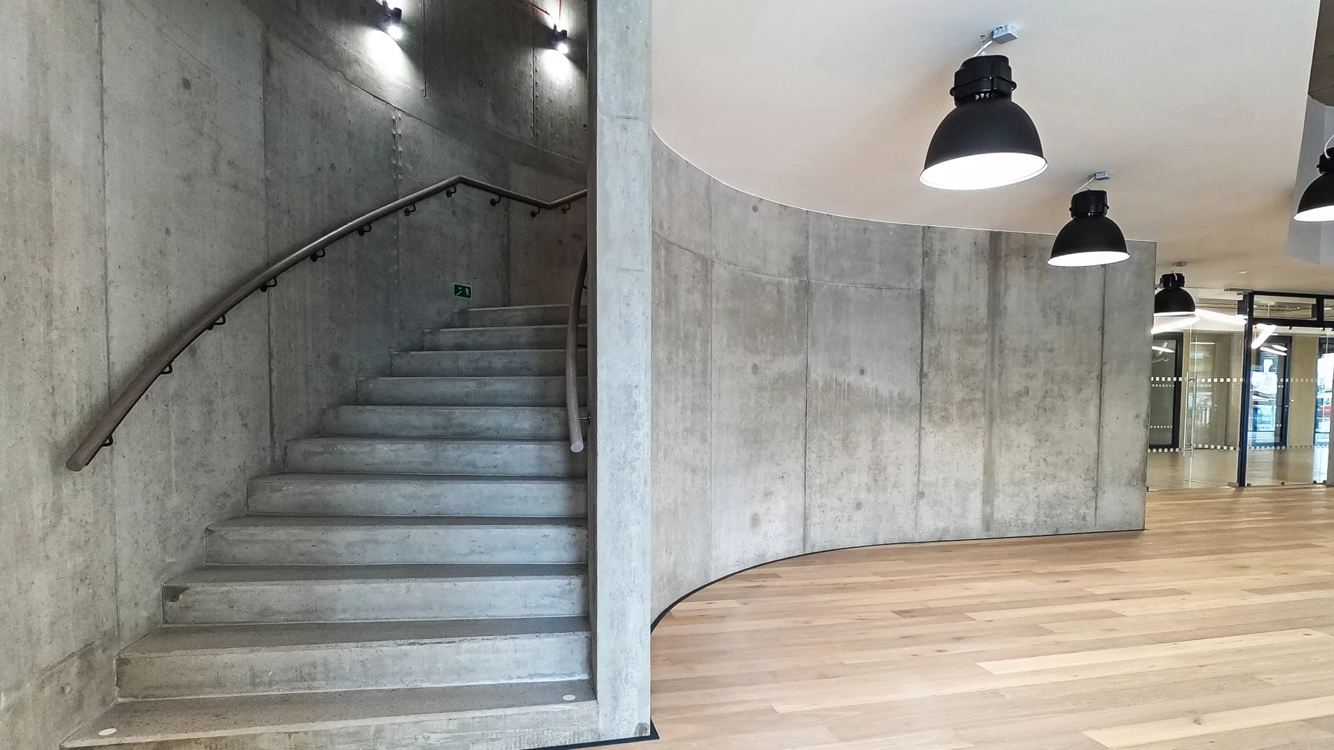 V prostorách auly a chodeb je možné vidět broušenou i leštěnou variantu povrchové úpravy litých podlah CemLevel.